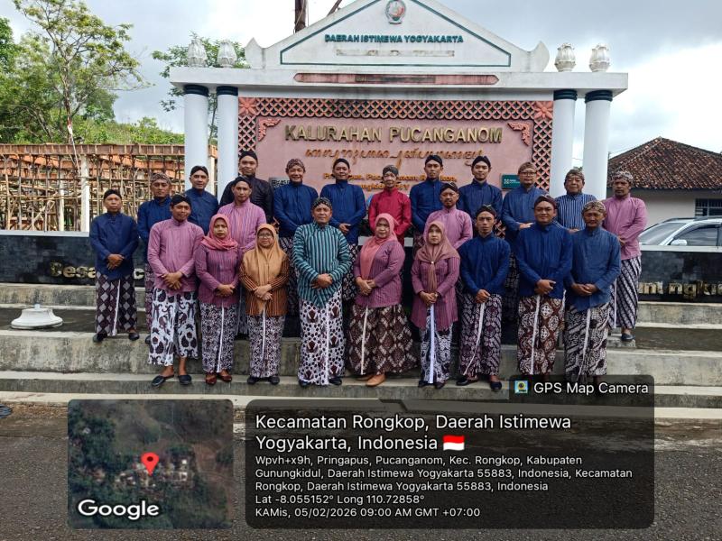 Sesi foto bersama Jajaran Pemerintah Kalurahan Pucanganom dalam rangka pelaksanaan perintah bahwa setiap hari Kamis Pon untuk menggunakan pakaian adat Jawa GAGRAK Jogjakarta, dan melaksanakan foto bersama di depan papan penanda keistimewaan Jogjakarta yang selanjutnya dikirimkan secara berjenjang mulai dari tingkat Kapanewon sampai Kabupaten.