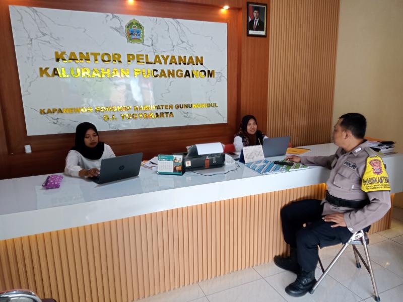 Selain bertugas langsung di warga masyarakat Kalurahan Pucanganom, Bhabinkamtibmas (Bripka AKHRORI YUSUF) juga menyempatkan diri untuk memonitor situasi kantor pelayanan umum Kalurahan Pucanganom. Beliau menanyakan terkait pelayanan umum berjalan lancar dan tertib tidaknya, kemudian segi keamanan serta menanyakan jenis pelayanan umum yang sudah dilaksanakan semacam apa.